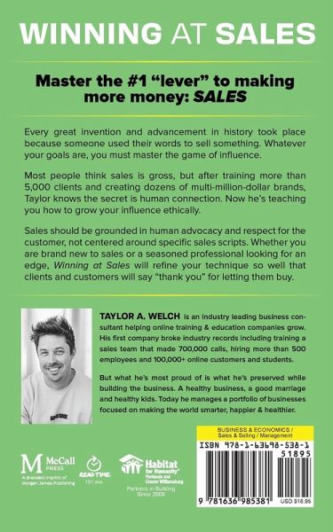 Learn to master the #1 "lever" to growing your personal income: sales. Every great invention and advancement in history took place because someone was willing to use their words to sell something. Whether you are trying to grow a business, make more money, or simply live a better life, you need to master the game of influence. The concepts Taylor shares in this book have created dozens of 7 and 8 figure brands. Now, for the first time, he's giving you the masterpiece “source material” to influencing human decisions. He pulls on the personal experience of training almost 5,000 clients, hundreds of thousands of customers, and over 700,000 sales calls to teach you how to grow your influence without being gross. You will not only get better at sales, you will learn the secret art of human connection. Filled with models, concepts, frameworks and scripts, this book is a guide that you will read again and again to influence people to make decisions that are good for them and good for you. Learning how to sell is about more than just what to say. It’s how you say it; when you say it; when to say nothing at all; and the emotional state you are in when you finally do speak. It’s about human advocacy and respect for your customer. And whether you’re brand new to sales or a seasoned professional looking for an edge, it will teach you to get so good that your clients and customers will say “thank you” for letting them buy.