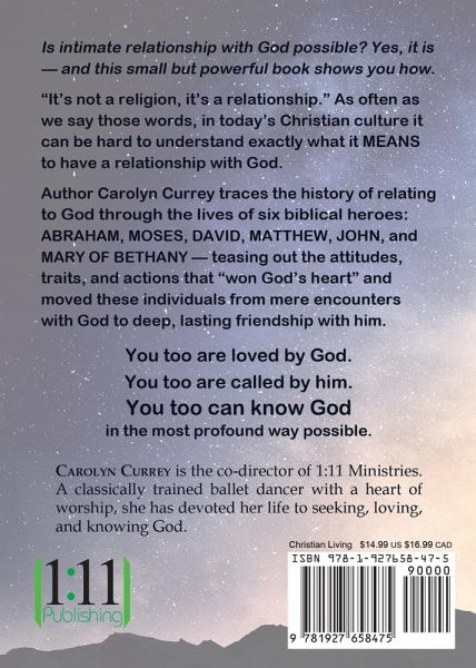 Is intimate relationship with God possible? Yes, it is — and this small but powerful book shows you how. "It’s not a religion, it’s a relationship." As often as we say those words, in today’s Christian culture it can be hard to understand exactly what it MEANS to have a relationship with God. Author Carolyn Currey traces the history of relating to God through the lives of six biblical heroes — Abraham, Moses, David, Matthew, John, and Mary of Bethany — teasing out the attitudes, traits, and actions that "won God’s heart" and moved these individuals from mere encounters with God to deep, lasting friendship with him. You too are loved by God. You too are called by him. You too can know God in the most profound way possible.
