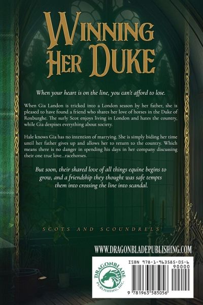 When your heart is on the line, you can't afford to lose. When Gia Landon is tricked into a London season by her father, she is pleased to have found a friend who shares her love of horses in the Duke of Roxburghe. The surly Scot enjoys living in London and hates the country, while Gia despises everything about society. Hale knows Gia has no intention of marrying. She is simply biding her time until her father gives up and allows her to return to the country. Which means there is no danger in spending his days in her company discussing their one true love...race horses. But soon, their shared love of all things equine begins to grow, and a friendship they thought was safe tempts them into crossing the line into scandal. Scots and Scoundrels Book 1 - Winning Her Duke Book 2 - Discovering Her Earl Book 3 - Tempting Her Viscount