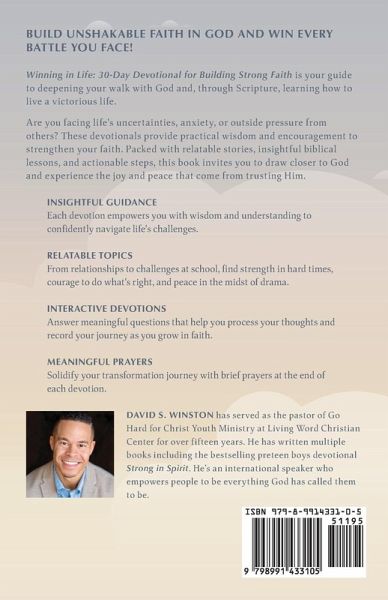 Build unshakable faith in God and win every battle you face! Winning in Life: 30-Day Devotional for Building Strong Faith for Teens and Young Adults is your guide to deepening your walk with God and, through Scripture, learning how to live a victorious life. Are you facing life's uncertainties, anxiety, or outside pressure from others? These devotionals provide practical wisdom and encouragement to strengthen your faith. Packed with relatable stories, insightful biblical lessons, and actionable steps, this book invites you to draw closer to God and experience the joy and peace that come from trusting Him. INSIGHTFUL GUIDANCE: Each devotion empowers you with wisdom and understanding to confidently navigate life's challenges. RELATABLE TOPICS: From relationships to challenges at school, find strength in hard times, courage to do what's right, and peace in the midst of drama. INTERACTIVE DEVOTIONS: Answer meaningful questions that help you process your thoughts and record your journey as you grow in faith. MEANINGFUL PRAYERS: Solidify your transformation journey with brief prayers at the end of each devotion. David S. Winston has served as the pastor of Go Hard for Christ Youth Ministry at Living Word Christian Center for over fifteen years. He has written multiple books, including the bestselling preteen boys devotional Strong in Spirit. He's an international speaker who empowers people to be everything God has called them to be.