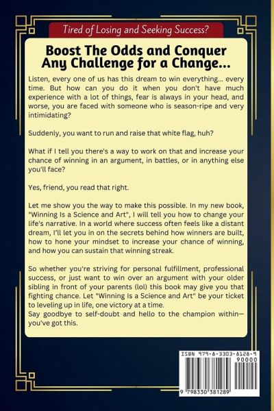 Tired of Losing and Seeking Success? Boost The Odds and Conquer Any Challenge for a Change... Listen, every one of us has this dream to win everything... every time. But how can you do it when you don't have much experience with a lot of things, fear is always in your head, and worse, you are faced with someone who is season-ripe and very intimidating? Suddenly, you want to run and raise that white flag, huh? What if I tell you there's a way to work on that and increase your chance of winning in an argument, in battles, or in anything else you'll face? Yes, friend, you read that right. Let me show you the way to make this possible. In my new book, "Winning Is a Science and Art", I will tell you how to change your life's narrative. In a world where success often feels like a distant dream, I'll let you in on the secrets behind how winners are built, how to hone your mindset to increase your chance of winning, and how you can sustain that winning streak. So whether you're striving for personal fulfillment, professional success, or just want to win over an argument with your older sibling in front of your parents (lol) this book may give you that fighting chance. Let "Winning Is a Science and Art" be your ticket to leveling up in life, one victory at a time. Say goodbye to self-doubt and hello to the champion within-you've got this.