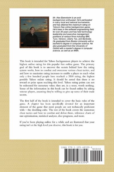 This book is intended for Yahoo backgammon players to achieve the highest online rating for this popular free online game. This book uncovers the secrets behind how the rating system works, how to combat and defeat various cheat tactics, and how to maximize rating increases, enabling you to reach the Yahoo maximum rating (3500). However, there is no reward or prize upon reaching this level. Yahoo rating points can not be redeemed for monetary value; they are, in a sense, worth nothing. Some of the information in this book can be found online by asking veteran players, assuming they're willing to give up some of their secrets. The first half of the book is intended to cover the basic rules of the game. A chapter has been specifically devoted for an important element of the game that most people are not technically proficient with: the doubling cube. The rest of the book covers cheat tactics and how to combat and defeat them, reference charts of rate optimization, statistical analyses, dice programs, and more.