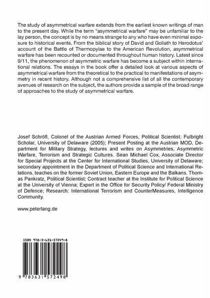 Contents: Edwin R. Micewski: Asymmetry and Western Society/Culture-Critical Reflections - Josef Schröfl: Worldwide Asymmetries - Heinz Gärtner: International Institutions, Multilateralism and Powerful States: Asymmetries in International Relations Theories - Werner Freistetter: Asymmetric Wars in the Bible? Theological-ethical Considerations on Violence and War in the Old Testament - Edwin R. Micewski: On the Moral-Philosophical Legitimacy of Asymmetric Warfare - Murad L. Wisniewski: Ecological Threats to National Security: Should the Security Policy Agenda be Expanded to Incorporate Environmental Security? - Walter E. Feichtinger: Asymmetry in International Politics - Herfried Münkler: Asymmetry and the Process of Asymmetrization - Thomas Pankratz/Tibor Benczur-Juris: Necessity, Opportunities and Limits on the Cooperation of Intelligence Agencies in the Fight against International Terrorism in the Framework of the European Union - Wolfgang Schober: Conflict Communication in Times of Asymmetric Warfare - Samuel R. Schubert: The Asymmetric Power of Terrorism - Martin Malek: Asymmetric Warfare in Chechnya - David Francis: Asymmetrical Warfare and the Regionalisation of Domestic Civil Wars in Africa: Implications for EU Interventions - Stefan M. Aubrey: Combating Al-Qaeda and the Jihadist Ideology: An In-Progress Review of the US National Counter-Terrorism Strategy - Joey S.R. Long: Managing Security and Addressing Asymmetric Threats through Multilateral Means in East Asia - Klaus Peter Lohmann: On Development of Modern Warfare. Basic Asymmetries and a Possible Strategy.