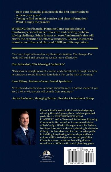 Does your financial plan provide the best opportunity to achieve your goals? Trying to find essential, concise, and clear information? Want to enjoy the process? WINNING the Financial Planning Game explains how to transform personal finance into a fun and exciting problem solving challenge. Ethan focuses on core fundamentals that will clarify the execution of effective strategies. Become inspired to examine your financial plan and fulfill your life aspirations. TESTIMONIALS: "I've been inspired to review my financial situation. The changes I've made will build and protect my wealth more effectively!" Dan Schweigel, CEO Schweigel Capital LLC "This book is straightforward, concise, and educational. It taught me how to construct a sound financial foundation. I'm on the path to winning!" Leor Elfassy, Business Owner, Sound Specialists "I've learned a tremendous amount about finance. It doesn't matter if you are 21, 40, or 65; anyone will benefit from reading it." Aaron Buchanan, Managing Partner, Braddock Investment Group ABOUT THE AUTHOR: Ethan Schmidt assists individuals in designing a winning financial game plan to achieve personal goals. He is a CERTIFIED FINANCIAL PLANNER and a Chartered Retirement Planning Counselor. He created an investment division called Catalyst Wealth Management at his father's boutique insurance and estate planning business in Chicago. As President and Partner, he takes pride in building long-lasting relationships and has a unique ability to design customized portfolios. Ethan focuses on concepts that will guide and reveal how to WIN the financial planning game.