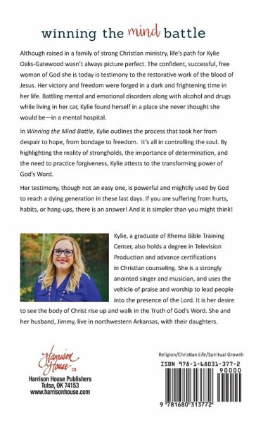 Although raised in a family of strong Christian ministry, life's path for Kylie Oaks-Gatewood wasn't always picture perfect. The confident, successful, free woman of God she is today is testimony to the restorative work of the blood of Jesus. Her victory and freedom were forged in a dark and frightening time in her life. Battling mental and emotional disorders along with alcohol and drugs while living in her car, Kylie found herself in a place she never thought she would be in a mental hospital. In Winning the Mind Battle, Kylie outlines the process that took her from despair to hope, from bondage to freedom. It's all in controlling the soul. By highlighting the reality of strongholds, the importance of determination, and the need to practice forgiveness, Kylie attests to the transforming power of God's Word. Her testimony, though not an easy one, is powerful and mightily used by God to reach a dying generation in these last days. If you are suffering from hurts, habits, or hang-ups, there is an answer! And it is simpler than you might think!