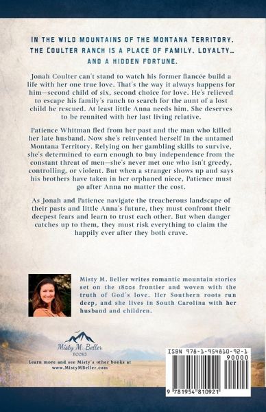 In the wild mountains of the Montana Territory, the Coulter ranch is a place of family, second chances...and a hidden fortune. Jonah Coulter can't stand to watch his former fiancée build a life with her one true love. That's the way it always happens for him-second child of six, second choice for love. He's relieved to escape his family's ranch to search for the aunt of a lost child he rescued. At least little Anna needs him. She deserves to be reunited with her last living relative. Patience Whitman fled from her past and the man who killed her late husband. Now she's reinvented herself in the untamed Montana Territory. Relying on her gambling skills to survive, she's determined to earn enough to buy independence from the constant threat of men-she's never met one who isn't greedy, controlling, or violent. But when a stranger shows up and says his brothers have taken in her orphaned niece, Patience must go after Anna no matter the cost. As Jonah and Patience navigate the treacherous landscape of their pasts and little Anna's future, they must confront their deepest fears and learn to trust each other. But when danger catches up to them, they must risk everything to claim the happily ever after they both crave. From a USA Today bestselling author comes a mountain saga filled with high stakes adventure, found family, and love that heals wounded hearts.