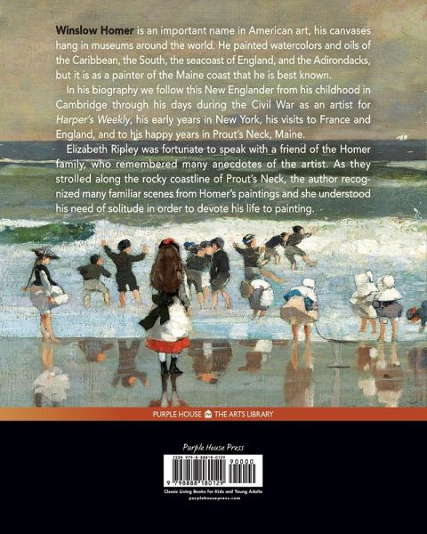 Winslow Homer is an important name in American art, his canvases hang in museums around the world. He painted watercolors and oils of the Caribbean, the South, the seacoast of England, and the Adirondacks, but it is as a painter of the Maine coast that he is best known. In his biography we follow this New Englander from his childhood in Cambridge through his days during the Civil War as an artist for Harper's Weekly, his early years in New York, his visits to France and England, and to his happy years in Prouts Neck, Maine. Elizabeth Ripley was fortunate to speak with a friend of the Homer family, who remembered many anecdotes of the artist. As they strolled along the rocky coastline of Prouts Neck, the author recognized many familiar scenes from Homer's paintings and she understood his need of solitude in order to devote his life to painting.