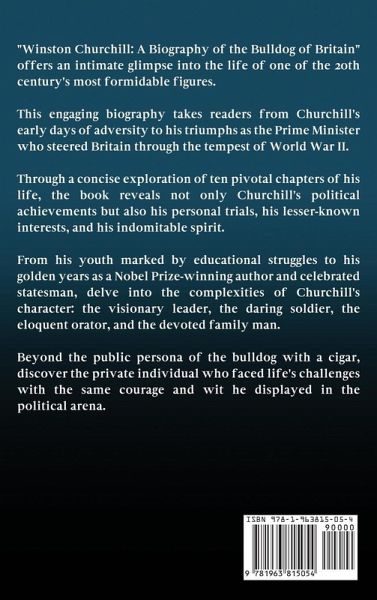 WINSTON CHURCHILL Discover the Man Who Shaped History: "Winston Churchill: A Biography of the Bulldog of Britain" Embark on an unforgettable journey into the heart of leadership, resilience, and the sheer force of will with "Winston Churchill: A Biography of the Bulldog of Britain." This engaging biography strips away the layers of myth to reveal the flesh-and-blood man behind the legend-Winston Churchill, a figure whose life story reads like an epic novel. From the grand corridors of Blenheim Palace where he was born to the smoke-filled rooms where he orchestrated some of the most critical decisions of World War II, this book offers a front-row seat to history. With vivid detail and insightful analysis, delve into the early struggles and triumphs that defined Churchill, exploring how a young boy with a stutter became the voice that rallied a nation against tyranny. But Churchill was more than a political titan. He was also a Nobel Prize-winning author, a passionate painter, and a family man with a complex personal life. This biography presents a balanced view, celebrating his achievements while not shying away from his flaws and failures. Each of the meticulously researched chapters serves as a window into different facets of Churchill's life, from his audacious military adventures to his strategic brilliance during the darkest days of the Second World War, and his life after leaving the grand stage of global politics. Whether you're a student of history, a lover of compelling biographies, or someone fascinated by the art of leadership, "Winston Churchill: A Biography of the Bulldog of Britain" is a must-read. It's not just the story of a man who changed the world-it's a testament to the power of determination, courage, and belief in one's convictions. Grab your copy today and step into the story of Winston Churchill, the man who became a symbol of perseverance in the face of adversity. Experience the life, the legacy, and the unbreakable spirit of the Bulldog of Britain.