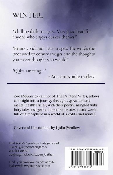 Zoe McGarrick (author of The Painter's Wife), allows us insight into a journey through depression and mental health issues, with their poetry, mingled with fairy tales and gothic literature, creates a dark world full of atmosphere in a world of a cold cruel winter. Cover and illustrations by Lydia Swallow.