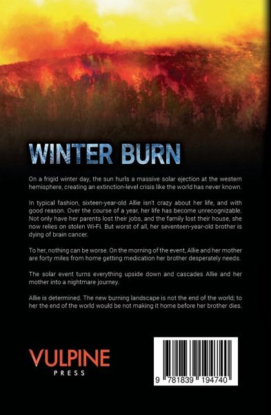 On a frigid winter day, the sun hurls a massive solar ejection at the western hemisphere, creating an extinction-level crisis like the world has never known. In typical fashion, sixteen-year-old Allie isn't crazy about her life, and with good reason. Over the course of a year, her life has become unrecognizable. Not only have her parents lost their jobs, and the family lost their house, she now relies on stolen Wi-Fi. But worst of all, her seventeen-year-old brother is dying of brain cancer. To her, nothing can be worse. On the morning of the event, Allie and her mother are forty miles from home getting medication her brother desperately needs. The solar event turns everything upside down and cascades Allie and her mother into a nightmare journey. Allie is determined. The new burning landscape is not the end of the world; to her the end of the world would be not making it home before her brother dies.