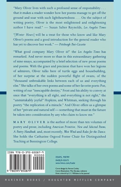 "On the subject of writing poetry, Oliver is the most enlightened and enlightening author I have read." -Susan Salter Reynolds, Los Angeles Times From the winner of the Pulitzer Prize and the National Book Award comes Winter Hours, Mary Oliver's most personal book yet. And never more so than in this extraordinary and engaging gathering of nine essays, accompanied by a brief selection of new prose poems and poems. With the grace and precision that have won her legions of admirers, Oliver talks here of turtle eggs and housebuilding, of her surprise at an unexpected whistling she hears, of the "thousand unbreakable links between each of us and everything else." She talks of her own poems and of some of her favorite poets: Poe, writing of "our inescapable destiny," Frost and his ability to convey at once that "everything is all right, and everything is not all right," the "unmistakably joyful" Hopkins, and Whitman, seeking through his poetry "the replication of a miracle." And Oliver offers us a glimpse as well of her "private and natural self?something that must in the future be taken into consideration by any who would claim to know me."