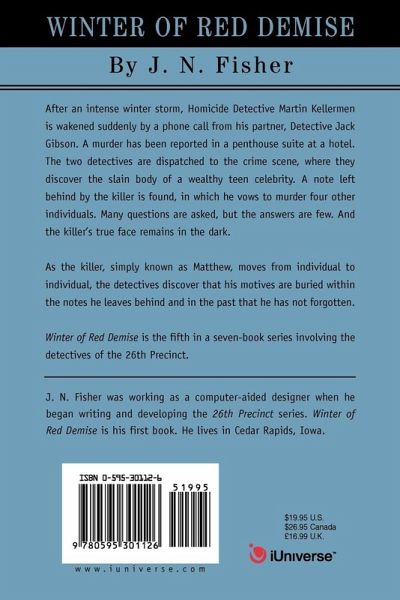 After an intense winter storm, Homicide Detective Martin Kellermen is wakened suddenly by a phone call from his partner, Detective Jack Gibson. A murder has been reported in a penthouse suite at a hotel. The two detectives are dispatched to the crime scene, where they discover the slain body of a wealthy teen celebrity. A note left behind by the killer is found, in which he vows to murder four other individuals. Many questions are asked, but the answers are few. And the killer's true face remains in the dark. As the killer, simply known as Matthew, moves from individual to individual, the detectives discover that his motives are buried within the notes he leaves behind and in the past that he has not forgotten. Winter of Red Demise is the fifth in a seven-book series involving the detectives of the 26th Precinct.