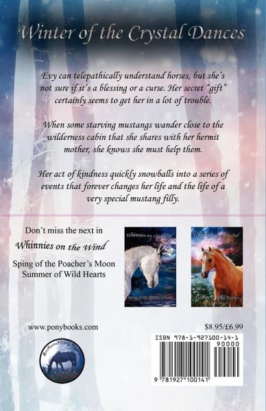 An exciting horse adventure, perfect for readers from 9 to 14 years old - and older according to many readers! Evy can telepathically understand horses, but she's not sure if it's a blessing or a curse. Her secret "gift" certainly seems to get her in lots of trouble. When some starving mustangs wander close to the wilderness cabin that she shares with her hermit mother, she knows she must help them. Her act of kindness quickly snowballs into a series of events that forever change her life and the life of a very special mustang filly.