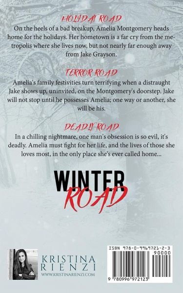 HOLIDAY ROAD On the heels of a bad breakup, Amelia Montgomery heads home for the holidays. Her hometown is a far cry from the metropolis where she lives now, but not nearly far enough away from Jake Grayson. TERROR ROAD Amelia's family festivities turn terrifying when a distraught Jake shows up uninvited on the Montgomery's doorstep. Jake will not stop until he possesses Amelia; one way or another, she will be his. DEADLY ROAD In a chilling nightmare, one man's obsession is so evil, it's deadly. Amelia must fight for her life, and the lives of those she loves most, in the only place she's ever called home...WINTER ROAD.