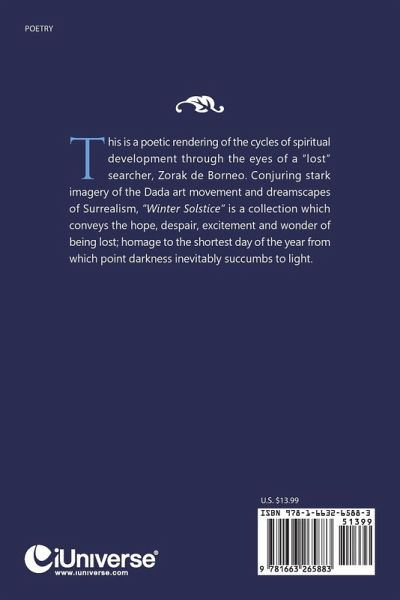 This is a poetic rendering of the cycles of spiritual development through the eyes of a "lost" searcher, Zorak de Borneo. Conjuring stark imagery of the Dada art movement and dreamscapes of Surrealism, "Winter Solstice" is a collection which conveys the hope, despair, excitement and wonder of being lost; homage to the shortest day of the year from which point darkness inevitably succumbs to light.