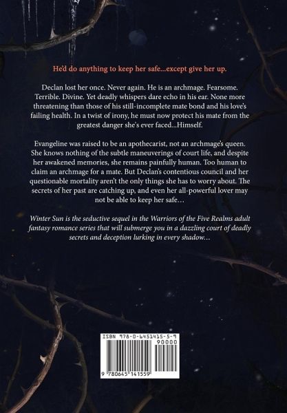 He'd do anything to keep her safe...except give her up. Declan lost her once. Never again. He is an archmage. Fearsome. Terrible. Divine. Yet deadly whispers dare echo in his ear. None more threatening than those of his still-incomplete mate bond and his love's failing health. In a twist of irony, he must now protect his mate from the greatest danger she's ever faced...Himself. Evangeline was raised to be an apothecarist, not an archmage's queen. She knows nothing of the subtle maneuverings of court life, and despite her awakened memories, she remains painfully human. Too human to claim an archmage for a mate. But Declan's contentious council and her questionable mortality aren't the only things she has to worry about. The secrets of her past are catching up, and even her all-powerful lover may not be able to keep her safe... Winter Sun is the seductive sequel in the Warriors of the Five Realms adult fantasy romance series that will submerge you in a dazzling court of deadly secrets and deception lurking in every shadow...