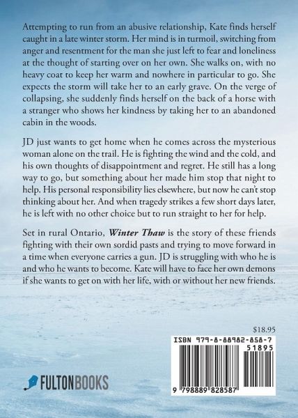 Attempting to run from an abusive relationship, Kate finds herself caught in a late winter storm. Her mind is in turmoil, switching from anger and resentment for the man she just left to fear and loneliness at the thought of starting over on her own. She walks on, with no heavy coat to keep her warm and nowhere in particular to go. She expects the storm will take her to an early grave. On the verge of collapsing, she suddenly finds herself on the back of a horse with a stranger who shows her kindness by taking her to an abandoned cabin in the woods. JD just wants to get home when he comes across the mysterious woman alone on the trail. He is fighting the wind and the cold, and his own thoughts of disappointment and regret. He still has a long way to go, but something about her made him stop that night to help. His personal responsibility lies elsewhere, but now he can't stop thinking about her. And when tragedy strikes a few short days later, he is left with no other choice but to run straight to her for help. Set in rural Ontario, Winter Thaw is the story of these friends fighting with their own sordid pasts and trying to move forward in a time when everyone carries a gun. JD is struggling with who he is and who he wants to become. Kate will have to face her own demons if she wants to get on with her life, with or without her new friends.