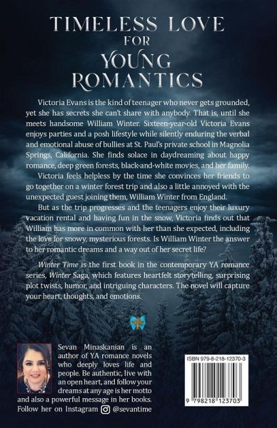 What if you met the love of your life in the most unexpected place? That's what happens to Victoria Evans, a bullied and unhappy teenager who attends a prestigious private high school in California. She has everything money can buy, except for the one thing she really wants: love. One day, she convinces her friends on a winter forest trip, hoping to find some peace and adventure. Little does she know that the trip will change her life forever, as she meets William Winter, a charming and mysterious boy from England. Winter Time is a story of love, friendship, and courage, as Victoria discovers her true self and fights for her happiness. With a touch of humor, intriguing characters, and surprising plot twists, this story will keep you hooked from the first page to the last. Winter Time is the first book in the contemporary YA fiction romance series Winter Saga, which features heartfelt storytelling, surprising plot twists, humor, intriguing characters, and super-duper female protagonist. The novel will capture your heart, thoughts, and emotions. It's simply the perfect book to curl up with on a winter's chilly night.