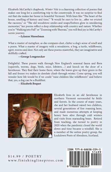 Elizabeth McCarthy's chapbook, Winter Vole is a charming collection of poems that makes one long for a comforting trip to the countryside. It was no surprise to find out that she makes her home in beautiful Vermont. With lines like "The heart of the house, smelling of history and time," "It would be ours to live in...after we evicted the racoons," or "The old woodstove smiles and snaps/Embers glow in smoldering memories," her poems reflect a deep relationship with country and nature. Whether you're "Walking into Fall" or "Zooming with Thoreau," you will find joy in McCarthy's scenic journey. -Lylanne Musselman What a master of metaphor, as she compares dust, clutter a dog's sense of smell and a poem. What a master of imagery with a woodstove, a bog, a turtle, wildflowers, egret, worms and deer. Not only are these poems masterful,; they are imaginative and skillfully crafted.-George Longenecker Delightful. These poems walk through New England's seasonal fauna and flora (squirrels, worms, dogs, birds, mice, lobsters...) and knock on the door of a farmhouse. They find their home there, where the leaves give up their green in the fall and frozen ivy makes its desolate climb through winter. Come spring, you will wonder how life would be if we could "raise children like wildflowers" and believe that, yes, a dog can be a Buddhist.-Elizabeth Boquet
