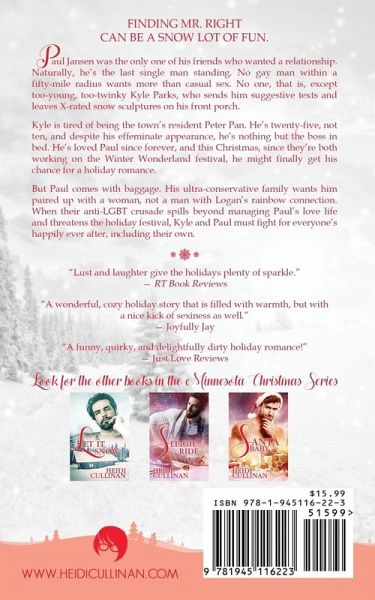 Finding Mr. Right can be a snow lot of fun. Paul Jansen was the only one of his friends who wanted a relationship. Naturally, he’s the last single man standing. No gay man within a fifty-mile radius wants more than casual sex. No one, that is, except too-young, too-twinky Kyle Parks, who sends him suggestive texts and leaves X-rated snow sculptures on his front porch. Kyle is tired of being the town’s resident Peter Pan. He’s twenty-five, not ten, and despite his effeminate appearance, he’s nothing but the boss in bed. He’s loved Paul since forever, and this Christmas, since they’re both working on the Winter Wonderland festival, he might finally get his chance for a holiday romance. But Paul comes with baggage. His ultra-conservative family wants him paired up with a woman, not a man with Logan’s rainbow connection. When their anti-LGBT crusade spills beyond managing Paul’s love life and threatens the holiday festival, Kyle and Paul must fight for everyone’s happily ever after, including their own.