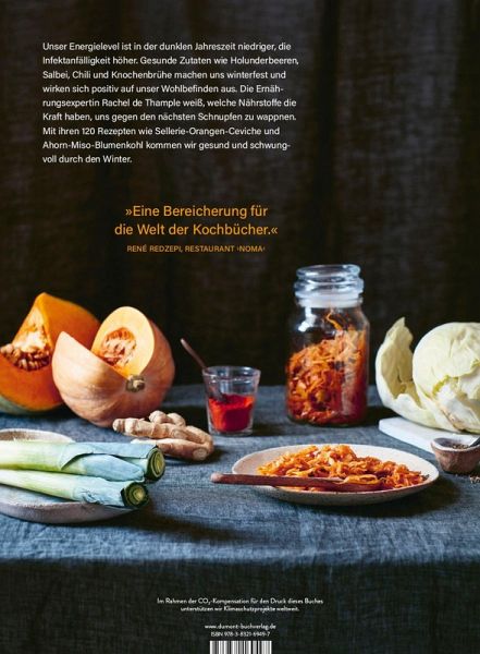 Die Tage sind kurz und kühl, das Energielevel ist niedrig und Abgeschlagenheit und Erschöpfung begleiten uns öfter durch die kalte Jahreszeit, als wir uns wünschen. Eine ausgewogene Ernährung ist dabei eine der Schrauben, an denen wir drehen können. Dieses Buch zeigt uns auf eine stille und ästhetische Weise, wie wir uns für miese Tage winterfest machen und uns mit den richtigen Zutaten und Nährstoffen gegen den nächsten Schnupfen wappnen können. 'Winterfest' liefert reichlich Inspiration und Ideen für mehr Wohlbefinden, regt an zum Innehalten, Entspannen - und Überdenken der bisherigen Ernährungsgewohnheiten. Rachel de Thample teilt ihre umfassende Expertise, schreibt über Kräuter und Gewürze, die das Immunsystem stärken, und gibt Tipps zu Wintergemüse und Fermenten, die uns gesund halten. Ihre modernen Rezepte laden zum sofortigen Nachkochen ein - die stärkende Gemüsebrühe für einen gesunden Darm ebenso wie Blumenkohl-Lasagne, Orangen-Dattel-Kuchen und Cranberry-Kombucha. Wellness für die Sinne!