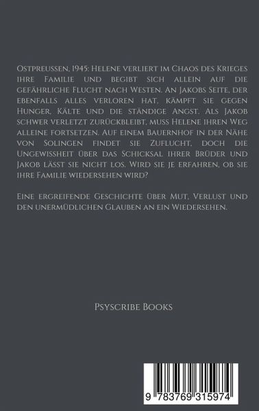 Ostpreußen, 1945: Helene verliert im Chaos des Krieges ihre Familie und begibt sich allein auf die gefährliche Flucht nach Westen. An Jakobs Seite, der ebenfalls alles verloren hat, kämpft sie gegen Hunger, Kälte und die ständige Angst. Als Jakob schwer verletzt zurückbleibt, muss Helene ihren Weg alleine fortsetzen. Auf einem Bauernhof in der Nähe von Solingen findet sie Zuflucht, doch die Ungewissheit über das Schicksal ihrer Brüder und Jakob lässt sie nicht los. Wird sie je erfahren, ob sie ihre Familie wiedersehen wird? Eine ergreifende Geschichte über Mut, Verlust und den unermüdlichen Glauben an ein Wiedersehen.