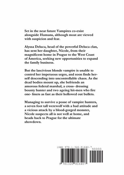 Set in the near future Vampires co-exist alongside Humans, although most are viewed with suspicion and fear. Alyssa Deluca, head of the powerful Deluca clan, has sent her daughter, Nicole, from their magnificent home in Prague to the West Coast of America, seeking new opportunities to expand the family business. But the lascivious blonde vampire is unable to control her impetuous urges, and soon finds her-self descending into uncontrollable chaos. As the dead bodies mount up, she befriends an amorous federal marshal, a cross- dressing bounty hunter and two ageing hit-men who fire one- liners as fast as their hollowed out bullets. Managing to survive a posse of vampire hunters, a seven foot tall werewolf with a bad attitude and a vicious attack by a blood-gorged monster, Nicole suspects all is not well at home, and heads back to Prague for the ultimate showdown.