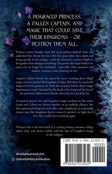 The disgraced captain who hates magic. The exiled princess who wields it. And a realm on the brink of war. Five years ago, Laena abandoned her crown. Now she lives in exile, tending her garden and hiding a deadly secret: she possesses magic in a realm where it's forbidden. And she's not the only one. When shadow monsters attack and assassins strike, there's only one person who can help her: Captain Callum Farrow, the infamous magic hunter of Aglye. He's sworn to destroy anyone who wields magic. She's sworn never to reveal her power. One touch is all it takes to ignite something dangerous between them. One kiss to make her forget why she can't fall for him. But as shadow monsters emerge and assassins strike, their forbidden attraction becomes the least of their problems. Ancient magic stirs in the realm. Enemies gather at the borders. And Laena must choose between the man she loves and the kingdoms she's sworn to protect. Some loves are worth risking everything for. Some duties demand you sacrifice it all. Winter's Fate is the first book in a sizzling fantasy romance series where duty and desire collide, and the fate of kingdoms hangs in the balance.