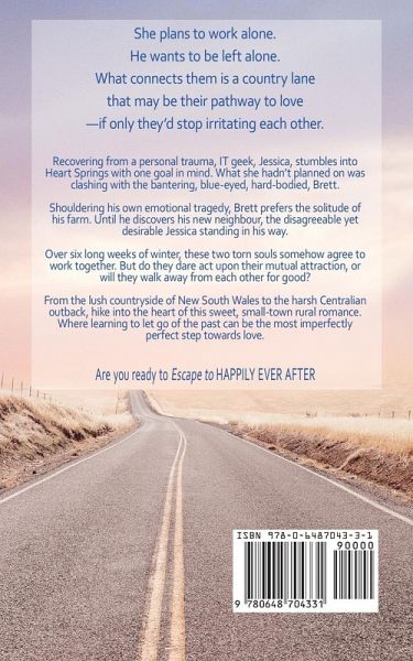 She plans to work alone. He wants to be left alone. What connects them is a country lane that may be their pathway to love-if only they'd stop irritating each other. Recovering from a personal trauma, IT geek, Jessica, stumbles into Heart Springs with one goal in mind. What she hadn't planned on was clashing with the bantering, blue-eyed, hard-bodied, Brett. Shouldering his own emotional tragedy, Brett prefers the solitude of his farm. Until he discovers his new neighbour, the disagreeable yet desirable Jessica standing in his way. Over six long weeks of winter, these two torn souls somehow agree to work together. But do they dare act upon their mutual attraction, or will they walk away from each other for good? From the lush countryside of New South Wales to the harsh Centralian outback, hike into the heart of this sweet, small-town rural romance. Where learning to let go of the past can be the most imperfectly perfect step towards love. Are you ready to Escape to HAPPILY EVER AFTER...