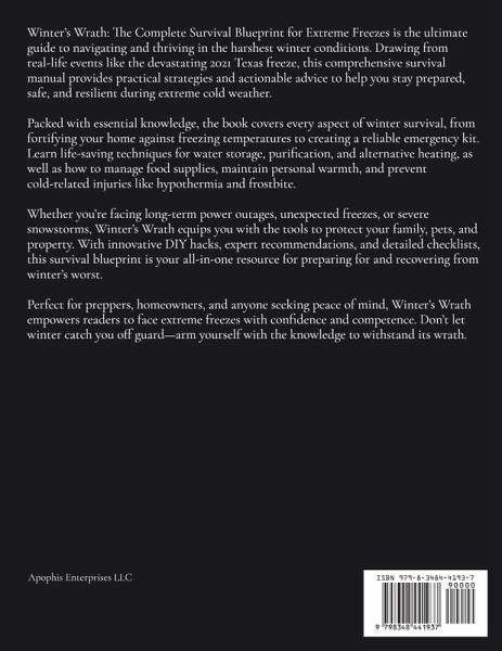 Winter's Wrath: The Complete Survival Blueprint for Extreme Freezes is the ultimate guide to navigating and thriving in the harshest winter conditions. Drawing from real-life events like the devastating 2021 Texas freeze, this comprehensive survival manual provides practical strategies and actionable advice to help you stay prepared, safe, and resilient during extreme cold weather. Packed with essential knowledge, the book covers every aspect of winter survival, from fortifying your home against freezing temperatures to creating a reliable emergency kit. Learn life-saving techniques for water storage, purification, and alternative heating, as well as how to manage food supplies, maintain personal warmth, and prevent cold-related injuries like hypothermia and frostbite. Whether you're facing long-term power outages, unexpected freezes, or severe snowstorms, Winter's Wrath equips you with the tools to protect your family, pets, and property. With innovative DIY hacks, expert recommendations, and detailed checklists, this survival blueprint is your all-in-one resource for preparing for and recovering from winter's worst. Perfect for preppers, homeowners, and anyone seeking peace of mind, Winter's Wrath empowers readers to face extreme freezes with confidence and competence. Don't let winter catch you off guard-arm yourself with the knowledge to withstand its wrath.
