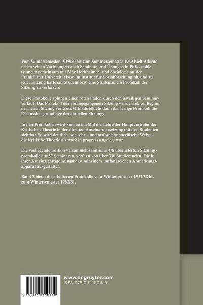 Vom Wintersemester 1949/50 bis zum Sommersemester 1969 hielt Adorno Seminare und Übungen in Philosophie und Soziologie an der Frankfurter Universität bzw. im Institut für Sozialforschung ab, und von jeder Sitzung hatte ein Student bzw. eine Studentin ein Protokoll zu verfassen. Band 2 bietet die erhaltenen Protokolle vom Wintersemester 1957/58 bis zum Wintersemester 1960/61.
