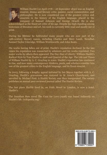 A sublime testament to the power of the classic English essay. Throughout all these essays runs a common philosophical weight, which is quite unique amongst the canon essayists. The essays in this book are still-to this day- readable, relevant, and above all, enjoyable (although some of his most famous essays are unfortunately absent). There is very little in the way of throat clearing, Hazlitt goes straight for the jugular with his scathing and evocative critiques on a broad range of subjects - poetry, politicians, sports. (Lucas Ford) About the Author William Hazlitt (10 April 1778 - 18 September 1830) was an English essayist, drama and literary critic, painter, social commentator, and philosopher. He is now considered one of the greatest critics and essayists in the history of the English language, placed in the company of Samuel Johnson and George Orwell. He is also acknowledged as the finest art critic of his age. Despite his high standing among historians of literature and art, his work is currently little read and mostly out of print. During his lifetime he befriended many people who are now part of the 19th-century literary canon, including Charles and Mary Lamb, Stendhal, Samuel Taylor Coleridge, William Wordsworth, and John Keats. His works having fallen out of print, Hazlitt's reputation declined. In the late 1990s his reputation was reasserted by admirers and his works reprinted. Two major works by others then appeared: The Day-Star of Liberty: William Hazlitt's Radical Style by Tom Paulin in 1998 and Quarrel of the Age: The Life and Times of William Hazlitt by A. C. Grayling in 2000. Hazlitt's reputation has continued to rise, and now many contemporary thinkers, poets, and scholars consider him one of the greatest critics in the English language, and its finest essayist. In 2003, following a lengthy appeal initiated by Ian Mayes together with A. C. Grayling, Hazlitt's gravestone was restored in St Anne's Churchyard, and unveiled by Michael Foot. A Hazlitt Society was then inaugurated. The society publishes an annual peer-reviewed journal called The Hazlitt Review. The last place Hazlitt lived in, on Frith Street in London, is now a hotel, Hazlitt's. The Jonathan Bate novel The Cure for Love (1998) was based indirectly on Hazlitt's life. (wikipedia.org)