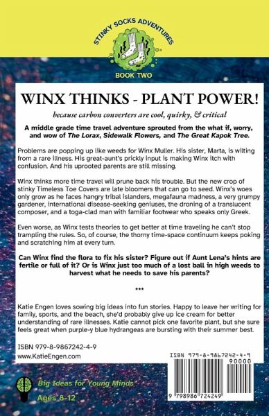 Winx Thinks - Plant Power! ...because carbon converters are cool, quirky, & critical A middle grade time travel adventure sprouted from the what if, worry, and wow of The Lorax, Sidewalk Flowers, and The Great Kapok Tree. Problems are popping up like weeds for Winx Muller. His sister, Marta, is wilting from a rare illness. His great-aunt's prickly input is making Winx itch with confusion. And his uprooted parents are still missing. Winx thinks more time travel will prune back his trouble. But the new crop of stinky Timeless Toe Covers are late bloomers that can go to seed. Winx's woes only grow as he faces hangry tribal islanders, megafauna madness, a very grumpy gardener, international disease-seeking geniuses, the droning of a translucent composer, and a toga-clad man with familiar footwear who speaks only Greek. Even worse, as Winx tests theories to get better at time traveling he can't stop trampling the rules. So, of course, the thorny time-space continuum keeps poking and scratching him at every turn. Can Winx find the flora to fix his sister? Figure out if Aunt Lena's hints are fertile or full of it? Or is Winx just too much of a lost ball in high weeds to harvest what he needs to save his parents?