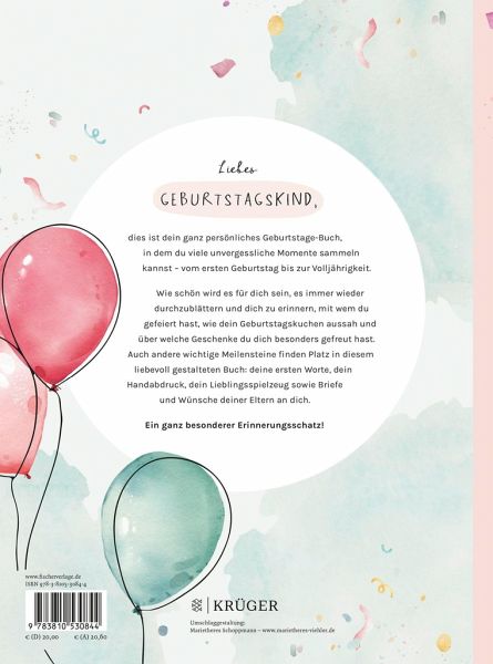 Erinnerungen sind wertvoll und verdienen es, festgehalten zu werden, weil sie uns auch Jahre später ein Lächeln auf die Lippen zaubern. Dieses wunderschöne Erinnerungsbuch für alle Geburtstage - von der Geburt bis zum 18. Lebensjahr - ist der perfekte Begleiter für jede Familie, denn es ist hochwertig in Design und Ausstattung und einfach in der Handhabung. Das Eintragebuch von Deutschlands größter Familienbloggerin und Vierfachmutter Marisa Hart bietet an jedem Geburtstag viel Platz für persönliche Notizen, Fotos, Handabdrücke und Briefe der Eltern an ihr Kind und kann auch nachträglich ausgefüllt werden. Auf den abwechslungsreich illustrierten Seiten können wertvolle Erinnerungen und Gedanken dokumentiert werden - sowohl zum jeweiligen Geburtstag über die schönsten Geschenke, die Geburtstagstorte und das Highlight des Tages, als auch zum jeweiligen Lebensjahr - vom liebsten Kuscheltier über die erste große Liebe bis hin zu Taten, auf die das Kind stolz sein kann.
