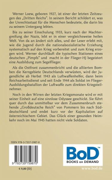 Werner Loew, geboren 1927, ist einer der letzten Zeitzeugen des "Dritten Reichs". In seinem Bericht schildert er, was der Unrechtsstaat für die Menschen bedeutete, die darin bis zu seinem Untergang lebten.Bis zu seiner Einschulung 1933, kurz nach der Machtergreifung der Nazis, lebt er in einer vergleichsweise heilen Welt. Von da an ändert sich alles, und der Leser erlebt mit, wie die Jugend durch die nationalsozialistische Erziehung systematisch auf den Krieg vorbereitet und zum Krieg erzogen wird. Werner durchläuft die typischen Stationen eines deutschen "Pimpfs" und macht in der Flieger-HJ begeistert eine Ausbildung zum Segelflieger.Als die Ostfront zusammenbricht und die alliierten Bomben die Kerngebiete Deutschlands verwüsten, wird der Jugendliche ab Herbst 1943 als Luftwaffenhelfer, dann beim Reichsarbeitsdienst und seit Ende 1944 als Soldat im Flieger-Ausbildungsbatallion der Luftwaffe zum direkten Kriegsteilnehmer.Noch in den Wirren der letzten Kriegsmonate wird er mit seiner Einheit auf eine sinnlose Odyssee geschickt. Sie führt quer durch das unmittelbar vor dem Zusammenbruch stehende "Großdeutsche Reich" von Pommern bis nach Süddeutschland und endet kurz vor der Kapitulation auf österreichischem Gebiet. Das Glück einer gesunden Heimkehr noch im Mai 1945 hatten nicht viele Soldaten.