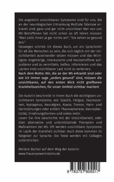 Die Autorin beschreibt in ihrem Buch die wichtigsten unsichtbaren Symptome, wie Spastik, Fatigue, Depressionen, Nystagmus, Neuralgien, Ataxie, Tremor, Harn- und Darmstörungen oder erklärt: Plasmapherese, Neuroplastizität, Ernährungsformen und vieles mehr. Lesen Sie ihre Geschichte mit der Unsichtbarkeit, oder über alternative und unterstützende Therapien und Maßnahmen bei MS. Oft werden unsichtbare Symptome im Laufe der Krankheit sichtbar. Auch diese kommen im Ratgeber zur Sprache. Die Texte werden mit Collagen unterstrichen.