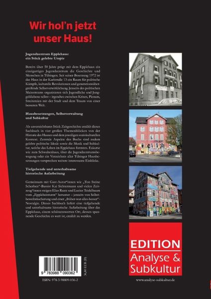 Jugendzentrum Epplehaus Tübingen: ein Stück gelebte Utopie Bereits über 50 Jahre prägt mit dem Epplehaus ein einzigartiges Jugendzentrum die Geschichte und Menschen in Tübingen. Seit seiner Besetzung 1972 ist das Haus in der Karlstraße 13 ein Raum für politische Kämpfe, kulturelle Revolutionen und generationsübergreifende Selbstverwirklichung. Jenseits des politischen Mainstreams organisieren sich Jugendliche und Junggebliebene selbst - irgendwo zwischen Krisen, Plenum, Streitereien mit der Stadt und dem Traum von einer besseren Welt. Hausbesetzungen, Selbstverwaltung und Subkultur Als unverzichtbares Stück Zeitgeschichte erzählt dieses Sachbuch in vier großen Themenblöcken von der Historie des Hauses und dem jeweiligen soziokulturellen Kontext. Zentrale Aspekte des Buchs sind zudem gelebte politische Ideale sowie die Musik und Subkultur, welche das Leben im Epplehaus formten. Exkurse wie zum Schwabenhaus, über die Jugendzentrumsbewegung oder ein Verzeichnis aller Tübinger Hausbesetzungen versprechen weitere interessante Einblicke. Tiefgehende und unterhaltsame historische Aufarbeitung Gemeinsam mit Gast-Autor*innen wie "Ton Steine Scherben"-Bassist Kai Sichtermann und vielen Zeitzeug*innen steigen Elias Raatz und Lucius Teidelbaum vom "Epplebeinturm" herunter - jenseits von Selbstbeweihräucherung und einer "früher-war-alles-besser"-Nostalgie. Dieses Sachbuch liefert eine tiefgehende und unterhaltsame historische Aufarbeitung über das Epplehaus, einem schützenswerten Ort, dessen spannende Geschichte es wert ist, erzählt zu werden. Mehr Infos unter: www.analyse-subkultur.de Über die vier Themenbereiche des Buchs: 1. "Von Jugendzentrumsbewegung und Hausbesetzungen" bietet einen Einstieg und liefert neben der Geschichte der Hausbesetzung spannende Hintergrundinformationen, wie über die Historie des Schwabenhaus oder eine Chronologie aller Tübinger Hausbesetzungen. 2. "Das Epplehaus als Jugendzentrum" fasst die Historie des Hauses ab 1968 bis 2025 zusammen und behandelt dabei beispielsweise Streitereien mit der Stadt, interne Probleme, die Professionalisierung durch Sozialarbeiter*innen, den Kinderladen oder das Frauencafé. 3. "Zwischen Politik und Interna" gibt vielen Aspekten einen Raum, die für ein linkes Jugendzentrum unabdingbar sind: Basisdemokratie und Entscheidungsstruktur, Graffiti und Subkultur, Awareness und queeres Leben, klare Positionierungen und Antifa. 4. "Über Musik und Events im Haus" sagt bereits alles Relevante zum thematischen Inhalt der unter dieser Überschrift gesammelten Kapitel: von Punkrock und Drum and Bass über Disco-Abende und Metalnights bis zu den Mittwochs- und Nachmittagskonzerten.. Mehr Infos unter: www.analyse-subkultur.de