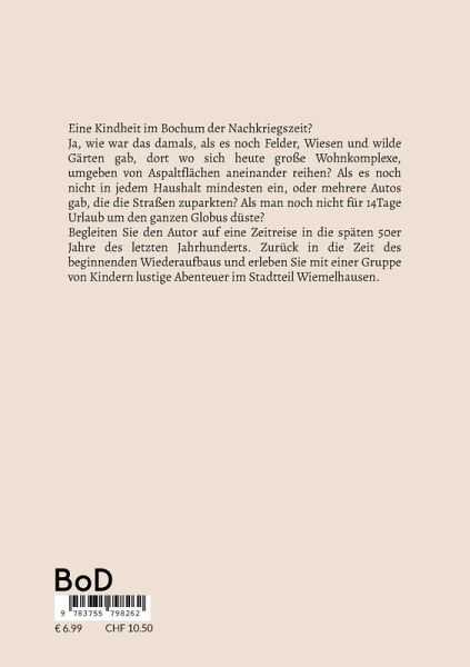 Eine Kindheit im Bochum der Nachkriegszeit?Ja, wie war das damals, als es noch Felder, Wiesen und wilde Gärten gab, dort wo sich heute große Wohnkomplexe, umgeben von Aspaltflächen aneinander reihen? Als es noch nicht in jedem Haushalt mindesten ein, oder mehrere Autos gab, die die Straßen zuparkten? Als man noch nicht für 14Tage Urlaub um den ganzen Globus düste?Begleiten Sie den Autor auf eine Zeitreise in die späten 50er Jahre des letzten Jahrhunderts. Zurück in die Zeit des beginnenden Wiederaufbaus und erleben Sie mit einer Gruppe von Kindern lustige Abenteuer im Stadtteil Wiemelhausen.