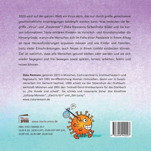 2020 wird auf der ganzen Welt ein Virus aktiv, das nur durch große gemeinsame gesellschaftliche Anstrengungen bekämpft werden kann. Was bedeuten die Begriffe "Virus" und "Pandemie"? Ziska Riemann`s farbenfrohe Bilder und die kurzen informativen Texte erklären Kindern im Vorschul- und Grundschulalter die Hintergründe, warum die Menschen sich im Falle einer Pandemie in ihrem Alltag an neue Herausforderungen anpassen müssen und wie Kinder und Familien, trotz vieler Einschränkungen, auch Neues in ihrem Umfeld entdecken können. Ziel ist natürlich, dass alle Menschen gesund bleiben oder werden. Und sie sich wieder begegnen und frei bewegen sowie spielen, lernen, arbeiten, feiern und reisen können.