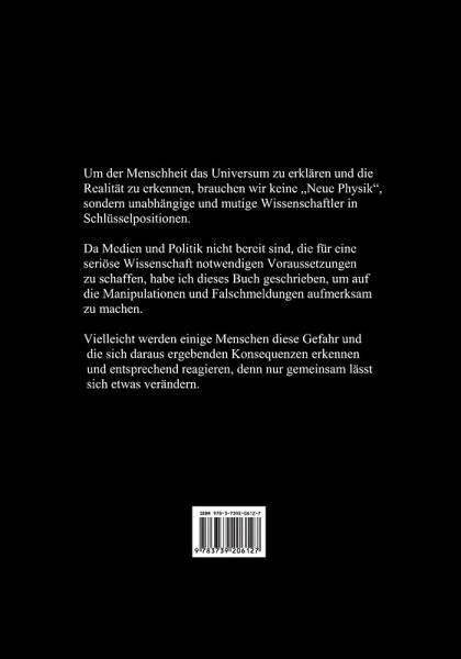 Um der Menschheit das Universum zu erklären und die Realität zu erkennen, brauchen wir keine "Neue Physik", sondern unabhängige und mutige Wissenschaftler in Schlüsselpositionen. Da Medien und Politik nicht bereit sind, die für eine seriöse Wissenschaft notwendigen Voraussetzungen zu schaffen, habe ich dieses Buch geschrieben, um auf die Manipulationen und Falschmeldungen aufmerksam zu machen. Vielleicht werden einige Menschen diese Gefahr und die sich daraus ergebenden Konsequenzen erkennen und entsprechend reagieren, denn nur gemeinsam lässt sich etwas verändern.