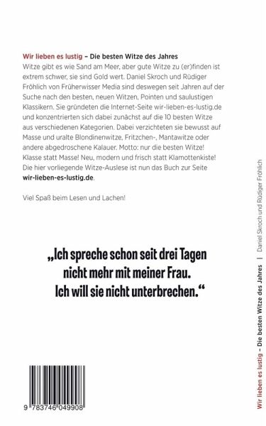 Witze gibt es wie Sand am Meer, aber gute Witze zu (er)finden ist extrem schwer, sie sind Gold wert. Daniel Skroch und Rüdiger Fröhlich von Früherwisser Media sind deswegen seit Jahren auf der Suche nach den besten, neuen Witzen, Pointen und saulustigen Klassikern. Sie gründeten die Internet-Seite wir-lieben-es-lustig.de und konzentrierten sich dabei zunächst auf die 10 besten Witze aus verschiedenen Kategorien. Dabei verzichteten sie bewusst auf Masse und uralte Blondinenwitze, Fritzchen-, Mantawitze und andere abgedroschene Kalauer. Motto: nur die besten Witze! Klasse statt Masse! Neu, modern und aktuell statt Klamottenkiste! Die hier vorliegende Witze-Sammlung ist nun das Buch zur neuen Seite wir-lieben-es-lustig.de.Viel Spaß beim Lesen und Lachen!Ich spreche schon seit drei Tagen nicht mehr mit meiner Frau. Ich will sie nicht unterbrechen.