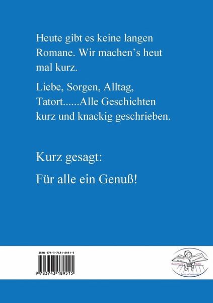Heute gibt es keine langen Romane. Wir machen's heut mal kurz. Liebe - Schicksal - Glück, Fantasy, Nervenkitzel, Spannung pur.....und Tatort ...... Alle Geschichten kurz und knackig geschrieben.Kurz gesagt:Für alle ein Genuß!