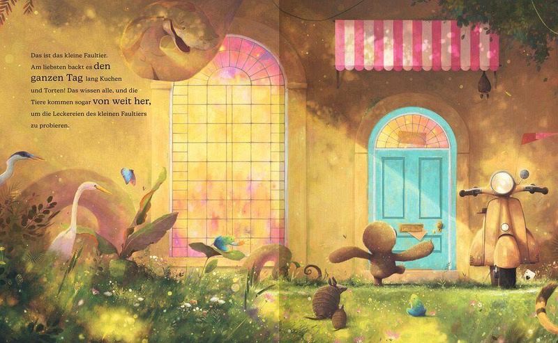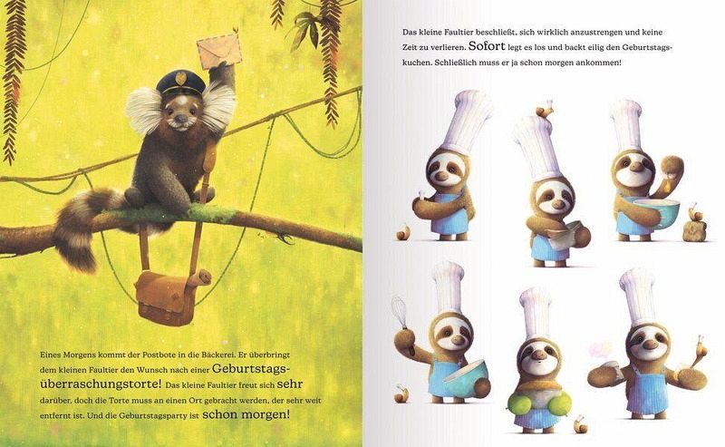 Die vielen Bilder von Faultier und Schnecki beim Kuchenbacken und verpacken, besonders die Details des Kochhuts und Motorradhelm bei der kleinen Schnecke, kamen hier bei meinen Kleinen am besten an. Ich fand es gab eine sehr ausdrucksstarke Doppelseite mit Schiff, Krokodil als Kapitän und vielen bunten Papageien, denen das kleine Faultier auf seinem Abenteuer, dem Ausliefern des Überraschungskuchen, begegnet.