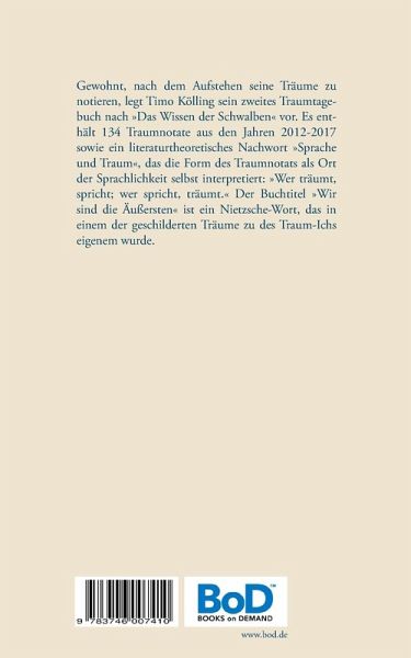 Gewohnt, nach dem Aufstehen seine Träume zu notieren, legt Timo Kölling sein zweites Traumtagebuch nach "Das Wissen der Schwalben" vor. Es enthält 134 Traumnotate aus den Jahren 2012-2017 sowie ein literaturtheoretisches Nachwort "Sprache und Traum", das die Form des Traumnotats als Ort der Sprachlichkeit selbst interpretiert: "Wer träumt, spricht; wer spricht, träumt." Der Buchtitel "Wir sind die Äußersten" ist ein Nietzsche-Wort, das in einem der geschilderten Träume zu des Traum-Ichs eigenem wurde.