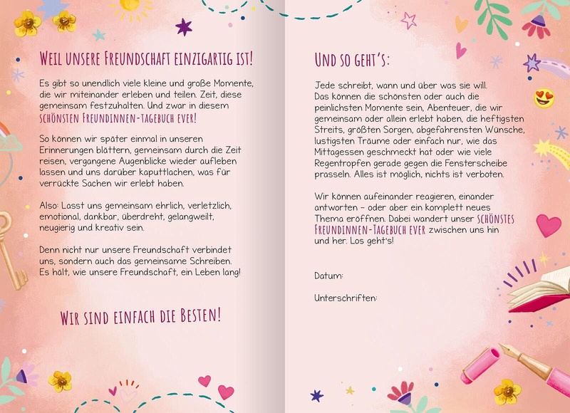 Eure Freundschaft im Mittelpunkt: Viel Platz und tolle Anregungen, Momente aus eurem Alltag und eurer Freundschaft festzuhaltenMit Schloss und vier Schlüsseln: Damit bis zu vier Freund:innen mitschreiben können und eure Geheimnisse stets sicher verwahrt sindWunderschön gestaltet: Liebevoll illustrierte Seiten laden zum Schreiben, Malen und Einkleben einHält ein Leben lang: Damit ihr immer eine Erinnerung an eure Freundschaft, eure Gedanken und gemeinsamen Erlebnisse habtEin ideales Geschenk: Für Mädchen ab 9 Jahren zum Geburtstag, Schulstart oder einfach als Überraschung zwischendurch