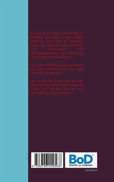 Es sind lyrische Texte, entstanden im Kreislauf der Liebe, in der totalen Erfüllung und nahe am Abgrund, Texte von Träumen und Verlangen, von Verletzungen und Hoffnungslosigkeit, von Verklärung und gnadenlosem Realismus.Die Liebe verschlingt uns und spuckt uns zum Schluss wieder aus, nackt und ohne Maskerade.Was bleibt: die Zuversicht, dass der Kreislauf der Liebe wieder beginnen möge, mit all den schönen und schrecklichen Eigenschaften.