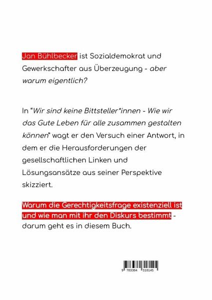 Jan Bühlbecker ist Sozialdemokrat und Gewerkschafter aus Überzeugung - aber warum eigentlich?In "Wir sind keine Bittsteller_innen - Wie wir das Gute Leben für alle zusammen gestalten können" wagt er den Versuch einer Antwort, in dem er die Herausforderungen der gesellschaftlichen Linken und Lösungsansätze aus seiner Perspektive skizziert.Dabei orientiert sich Jan Bühlbecker immer wieder an der berühmten Bittsteller_innenrede von Andreas Babler, dem SPÖ-Vorsitzen sowie an weiteren politischen und philosophien Persönlichkeiten der gesellschaftlichen Linken.Warum die Gerechtigkeitsfrage existenziell ist und wie man mit ihr den Diskurs von den Rechten zurückgewinnt - darum geht es in diesem Buch.