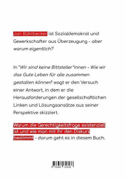 Jan Bühlbecker ist Sozialdemokrat und Gewerkschafter aus Überzeugung - aber warum eigentlich?In "Wir sind keine Bittsteller_innen - Wie wir das Gute Leben für alle zusammen gestalten können" wagt er den Versuch einer Antwort, in dem er die Herausforderungen der gesellschaftlichen Linken und Lösungsansätze aus seiner Perspektive skizziert.Dabei orientiert sich Jan Bühlbecker immer wieder an der berühmten Bittsteller_innenrede von Andreas Babler, dem SPÖ-Vorsitzen sowie an weiteren politischen und philosophien Persönlichkeiten der gesellschaftlichen Linken.Warum die Gerechtigkeitsfrage existenziell ist und wie man mit ihr den Diskurs von den Rechten zurückgewinnt - darum geht es in diesem Buch.