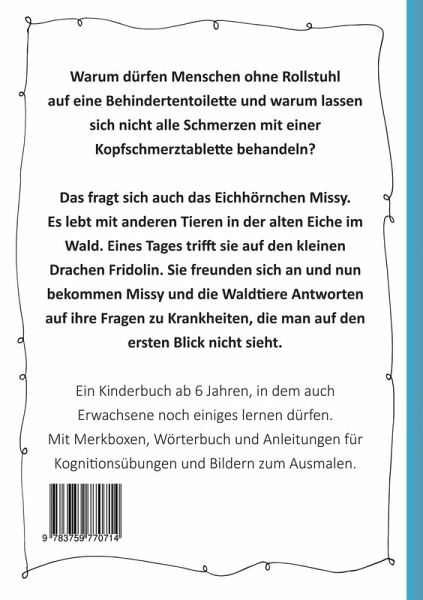 Warum dürfen Menschen ohne Rollstuhl auf eine Behindertentoilette und warum lassen sich nicht alle Schmerzen mit einer Kopfschmerztablette behandeln? Das fragt sich auch das Eichhörnchen Missy. Es lebt mit anderen Tieren in der alten Eiche im Wald. Eines Tages trifft sie auf den kleinen Drachen Fridolin. Sie freunden sich an und nun bekommen Missy und die Waldtiere Antworten auf ihre Fragen zu Krankheiten, die man auf den ersten Blick nicht sieht. Der Drache Fridolin erklärt Missy und ihren tierischen Freunden im Wald was es mit Behindertentoiletten, Depressionen, Schmerzen und kognitiven Einschränkungen auf sich hat und wie man Menschen dabei unterstützen kann. Ein Kinderbuch ab 6 Jahren, in dem auch Erwachsene noch einiges lernen dürfen. Mit Merkboxen, Wörterbuch und Anleitungen für Kognitionsübungen und Bildern zum Ausmalen.