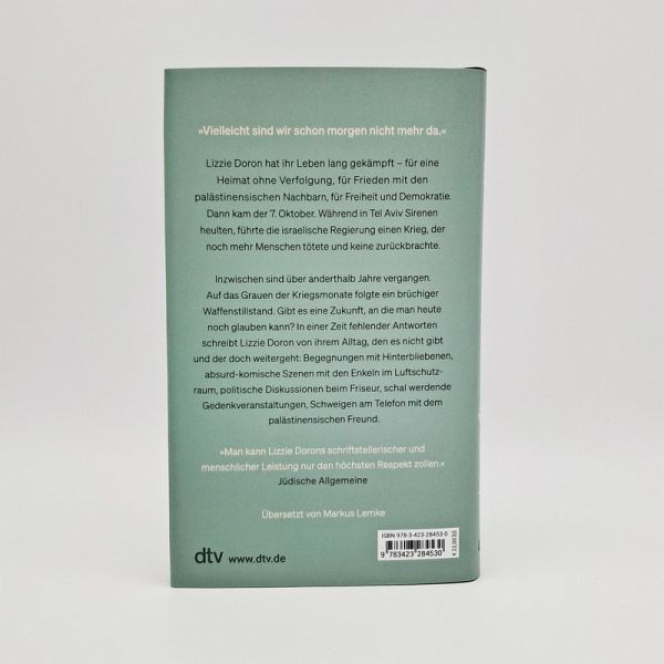 Inzwischen sind über anderthalb Jahre vergangen. Auf das Grauen der Kriegsmonate folgte ein brüchiger Waffenstillstand. Gibt es eine Zukunft, an die man heute noch glauben kann? In einer Zeit fehlender Antworten schreibt Lizzie Doron von ihrem Alltag, den es nicht gibt und der doch weitergeht: Begegnungen mit Hinterbliebenen, absurd-komische Szenen mit den Enkeln im Luftschutzraum, politische Diskussionen beim Friseur, schal werdende Gedenkveranstaltungen, Schweigen am Telefon mit dem palästinensischen Freund.